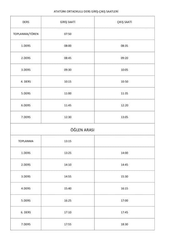 Değerli öğrencilerimiz ve velilerimiz 29/09/2025 Pazartesi gününden itibaren derslerimiz 35 dakika olacaktır. Sabah toplanma saati 07.50 olup ilk ders saat 08.00'da başlayacaktır. Çıkış saatimiz 13.05'dir.